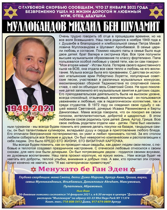 Moshiah Mullokandov ben Pinhos ve Shulamit (Cohen)